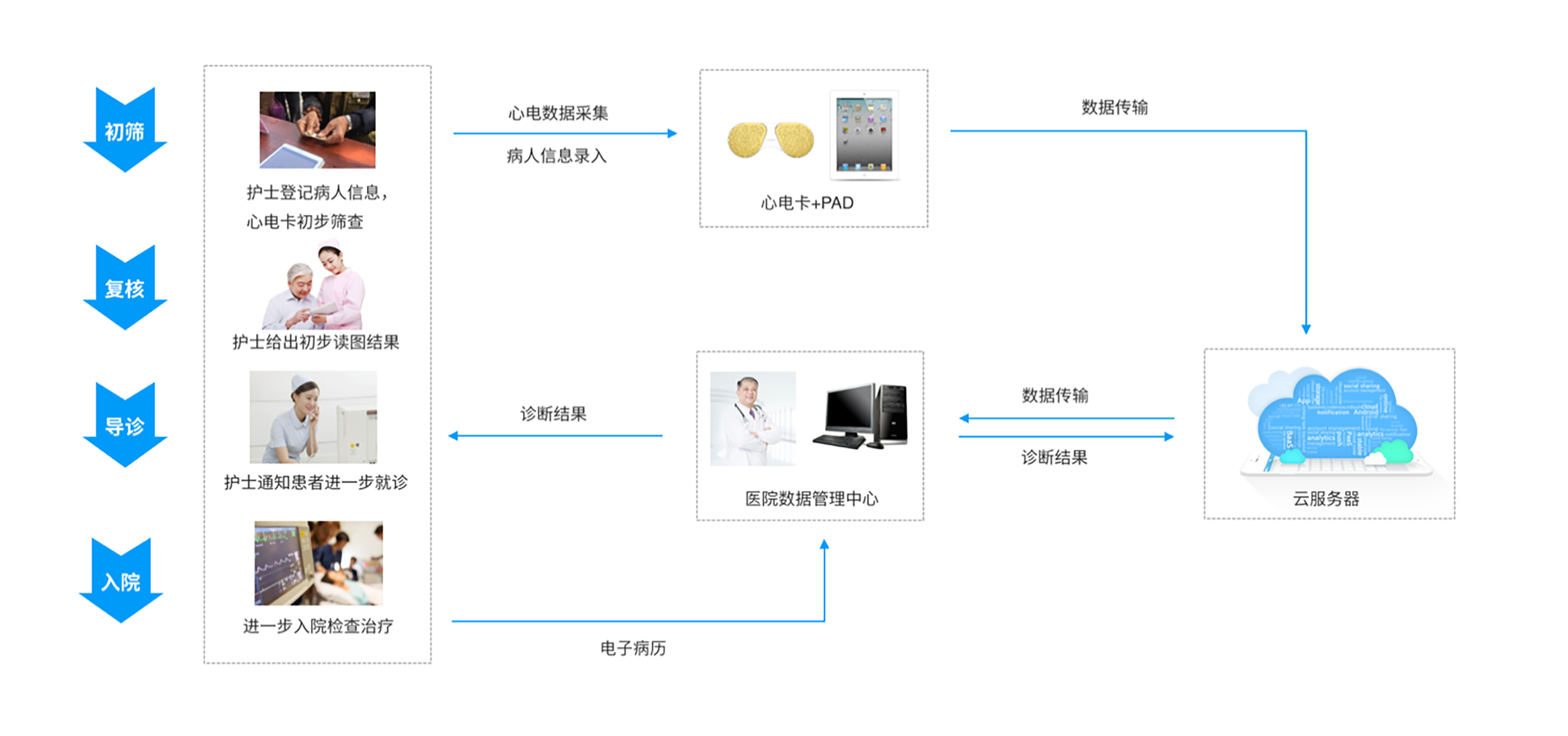 用于醫(yī)院門診房顫患者的初篩,門診患者候診期間,護士可登記病人信息并通過卡帕奇手持心電卡快速采集病人心電數(shù)據(jù),人工智能算法智能識別房顫,幫助護士導(dǎo)診。數(shù)據(jù)傳輸至云端永久保存,實時同步至醫(yī)院數(shù)據(jù)管理中心,便于建立心電大數(shù)據(jù)庫,實現(xiàn)醫(yī)院對患者跟蹤和治療的智能化管理。