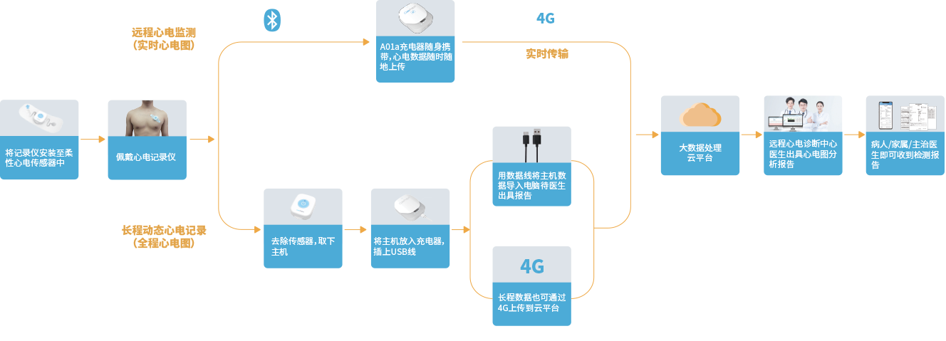 心電數(shù)據(jù)實時上傳,心律異常及時預(yù)警(心動過速/過緩、長RR間期、房顫等)