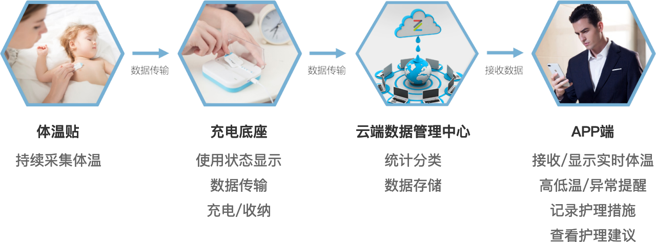 針對(duì)家庭用戶,可實(shí)時(shí)監(jiān)測(cè)家中兒童發(fā)燒時(shí)的體溫變化,尤其是發(fā)燒兒童的夜間監(jiān)護(hù),可自定義報(bào)警值,體溫異常自動(dòng)提醒。在家用版體溫貼的基礎(chǔ)上,可進(jìn)行OEM等合作。